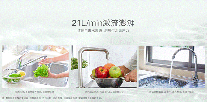 21L/min的大流量,基本還原自來水流速,淘洗、烹飪、清潔各種廚房用水場景迅速響應。