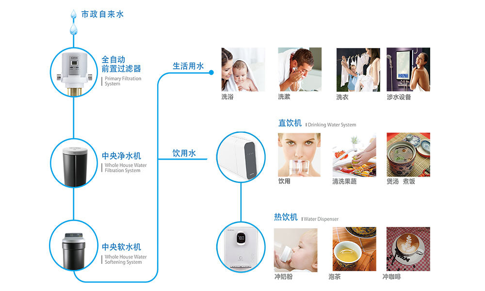 洗臉水用后可以洗腳、沖廁所;家中廢水可用來沖廁所;淘米水、煮過面條的水可用來洗碗筷,具有去油效果;養魚的水澆花,能促進花木生長。藍飄爾全屋凈水系統可有效將過濾廢水再利用沖廁所、澆花、洗車,最大化高效、節約用水。